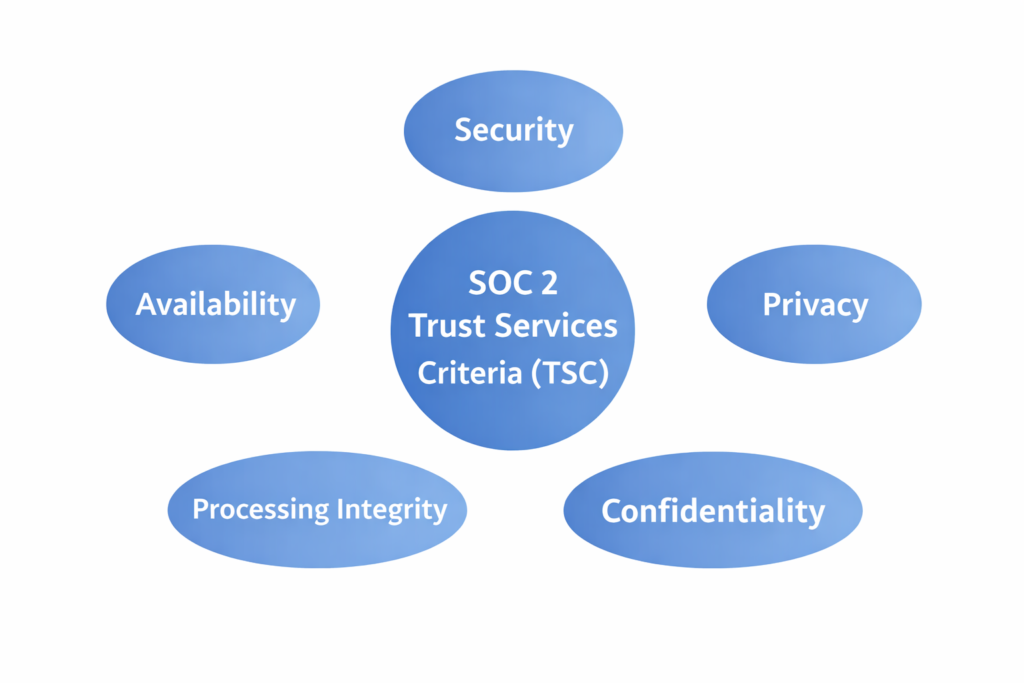 SOC 2 compliance is guided by the Trust Services Criteria, which auditors use to evaluate your organization’s security practices. There are five TSC categories: Security, Availability, Confidentiality, Processing Integrity, and Privacy. Of these, Security is always required, while the other four are scoped based on your company’s services and customer expectations.
